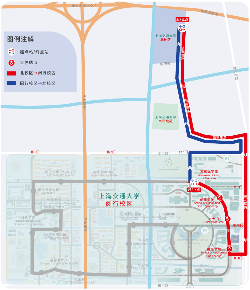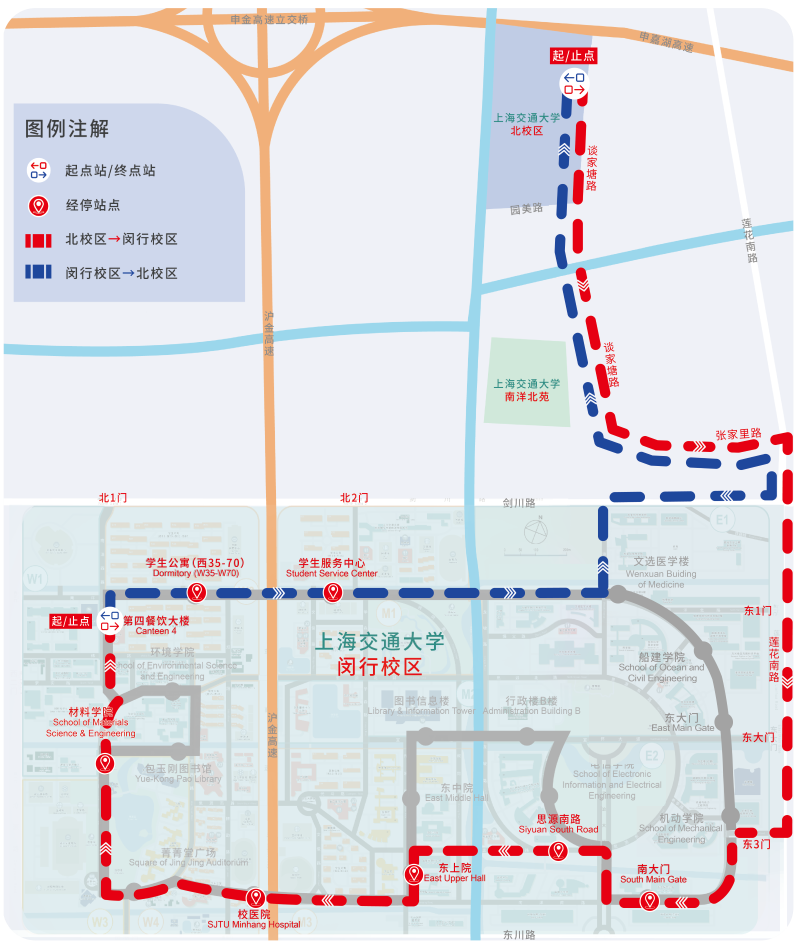 7、闵行校区候车点位于访客中心北侧(近菁菁堂),徐汇校区候车点位于南二楼北侧(近东大门)。